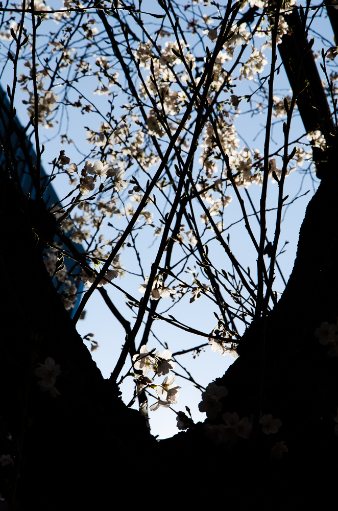 桜は、花びら一枚一枚が繊細で薄く、角度によって光の加減が動き、表情が変わります。シルエットになっていても、枝の複雑さが不思議なシルエットを作り、大変面白い。
